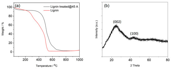 (a) Thermogravimetric analysis (TGA) results of lignin fibres and fibres treated with 45 A arc current, (b) XRD pattern of carbon fibres produced with 45 A arc current.