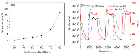 The humidity sensing properties of our carbon fibres were measured at different RH levels between 30% and 80%. The fibres treated at 45 A exhibited the highest carbonisation degrees and, therefore, the highest conductivity (lowest resistance). Together with their porous structure, this renders them the best candidates for high performance sensing materials. Therefore, we exclusively used the fibres treated at 45 A to demonstrate humidity sensing in the air. As shown in Figure 6, the relative resistance of the treated fibres increased with increasing RH level, which is mainly due to the physical adsorption of water molecules on the carbon fibre surface. The electrical conduction of p-type carbon fibres is dominated by holes. With increasing humidity, water molecules are adsorbed on the carbon fibre surface that serve as electron donors. The donated electrons from the water molecular transfer to the valence band of carbon fibres, leading to a decrease in the hole concentration and increasing the electrical resistance of the carbon fibres [6,9,51]. The microporous structure of the fibres after arc discharge treatment increased the interaction surface area between water molecules and carbon fibres. This facilitates the moisture adsorption onto the fibre surface [1,6]. The specific surface area and porosity of treated fibres will be further characterised by nitrogen adsorption/desorption and Brunauer–Emmett–Teller (BET) analysis [6]. More importantly, the humidity sensitivity (0.81/%RH, defined as the slope of linearly fitted humidity response vs. RH) is greater at higher relative humidity (i.e., 60–80%). One possible reason for this is that more water molecules are adsorbed on the fibre surface at higher RH compared to the water adsorption at lower RH. Another possible reason is the difference in electron transport mechanisms between the moisture and carbon fibre sensing layer [5]. To test the sensor response and recovery, the RH in the chamber was cycled between 30% and 80% RH, at a constant temperature of 23 °C. Our previous work found that the actual humidity changes between two different RH levels (i.e., 30% and 80%) in the environmental chamber do not occur immediately due to the large volume (400 L) of the chamber [1]. Each step therefore lasted 15 min to allow for full response/recovery. When the RH was repeatedly cycled between 30% and 80%, our carbon fibre-based sensor showed a stable and reproducible response (Figure 6b).