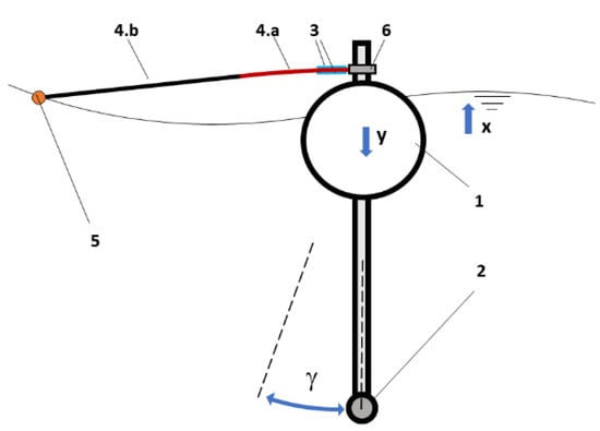 Scheme of the energy conversion apparatus for the Lab on sea unit: 1. spar buoy; 2. ballast; 3. piezoelectric patch transducers (PPTs); 4. band (a) deformable part, (b) rigid part; 5. external float; and, 6. rod grip. The vertical direction of the wave motion is indicated with x, while y is the vertical displacement of the spay buoy and γ is its angular oscillation.