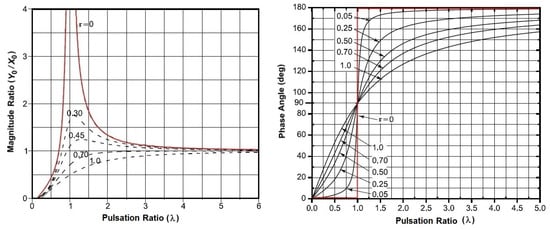The ratio (Equation (2)) between the magnitudes of the dynamical response (Y0) and forcing excitation (X0) depends on the pulsation of the excitation (ω), the pulsation of the system (ω0 = (k/m)1/2), the viscosity, and the critical value of viscosity (βcr = 2(k m)1/2):