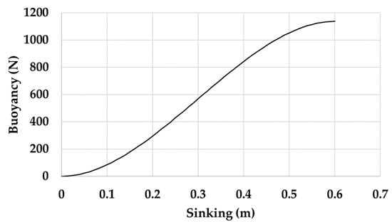 From the analysis of measurements that were performed on sea and in the artificial channel, the required geometric dimensions that allows the unit to satisfy the “fixed-point” condition were analytically obtained. Table 1 reports the geometric and mechanical data for the spar buoy and its counterweight. Having imposed a value of 600 mm for the diameter (d) of the buoy, the choice of values that are useful for sinking (S) was made so as to fall within the linear section of the relative “buoyancy-sinking” curve. The latter is the correlation between the weight and the hydrostatic thrust for the spar buoy (Figure 5). In particular, S = 500 mm was adopted, which corresponds to a buoyancy (B) of nearly 1050 N, and the value of 100 mm was set for the emerged height of the spherical cap (He). The ballast, which was also spherical in shape and made of lead (density of 11.34 kg/dm3), provided a counterweight of mass (M) equal to 57.5 kg and it was placed from the buoy center at a barycentric distance L = 2000 mm. When considering 2 Hz as the worst acceptable value for the oscillation frequency, the sizing of the buoy model provided sufficiently high values of λ (see Section 2.1) both as regards vertical oscillations (λvert = 10.62) than the angular ones (λang = 5.67). These values of λ satisfy the “fixed-point” assumption and allow the simple pendulum approximation for the spar buoy, as shown in Figure 3.