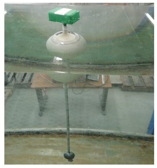 The model of the buoy built consists of a polystyrene sphere that was coated by deposition of polyester thermosetting epoxy fiber. The lead counterweight was made through a casting process on a dedicated plaster mold. The rigid rod for connecting the counterweight to the buoy was a cylindrical aluminum tubular with external diameter of 10 mm and thickness of 1 mm. On the top of the rod, a cylindrical seat accommodating a displacement sensor (iNEMO inertial module included in ST SensorTile.box, STMicroelectronics, Geneva, Switzerland) was realized. This sensor consisted of a triaxial gyroscope and a triaxial accelerometer. It was internally power supplied, and it allowed an easy reading of the measured quantities via Bluetooth communication and data logging on an internal SD card. The measurement range was selected between −500 and +500°/s for gyroscope and −39.24 and +39.24 m/s2 for accelerometer. Data sampling was performed at 104.0 Hz for both accelerometer and gyroscope signals, corresponding to a bandwidth cut-off frequency of 33.0 Hz according to sensors signal chain characteristics in the low energy mode. In this configuration, a gyroscope has a RMS rate noise value of 0.075°/s, while an accelerometer has a RMS rate noise value of 0.01962 m/s2. The sensitivity tolerance was ±1% on the measurement value both for the accelerometer and gyroscope. The temperature affects the accelerometer measurement in order of ±0.01% and the gyroscope measurement in the order of ±0.007%.
