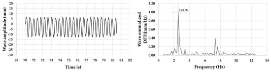 A dynamic buoyancy test of the scaled model in the above-mentioned controlled water channel was performed at a room temperature of 25 °C (Figure 6) [25]. There are various methodologies for evaluating the fluid dynamic behaviors in different applications [26]. The ripples-type waves were monitored via image acquisition and post-processed. For the acquisition, a camera Basler acA1300-30 gm GigE (Basler AG GmbH, Ahrensburg, Germany) with a CCD sensor (Sony ICX445, resolution of 1296 pixel × 966 pixel) and a 35 mm lens (C23-3520-2 M F2.0) were used. The motion reconstruction of the ripples-type waves was computed through NI Image Acquisition module on the LabView environment (National Instruments, Depew, NY, USA). The average value found for the imposed oscillation frequency was of 2.63 Hz, in line with the most representative frequency values of ripples-type waves, as shown in Figure 7. Acquisitions from both the on-board accelerometer and gyroscope were performed at 104.0 Hz. The ST SensorTile.box, which was mounted on the scaled buoy, returned values confirming the accomplishment of the required “fixed-point” condition.