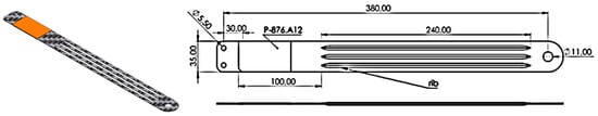 A rectangular band of 1 mm in thickness and length equal to 380 mm was designed to satisfy the law in Section 1 [21,22]. Its effective length was 350 mm. At the free end, a 11 mm hole allowed for the insertion of the light float, able to follow the wave motion without altering it. Carbon fiber was the material that was chosen for the deformable band. Six epoxy resin ribs (240 × 5.0 × 1.2 mm3) were moulded along the two faces of the rectangular plate to limit the strain where the patches are not installed. Figure 8 shows the deformable band with two PPTs (mod. DuraAct P-876 A.12, Physik Instrumente GmbH, Karlsruhe, Germany) bonded one on each side. The piezo-active element of the PPT is encapsulated into a polymeric case, made of Kapton, with a thickness of 0.5 mm and then glued on the deformable band by means of a cyanoacrylate layer. This configuration guarantees that, at the investigated frequencies and displacements, a rigid constraint between PPT and deformable band is ensured, as reported in [18].