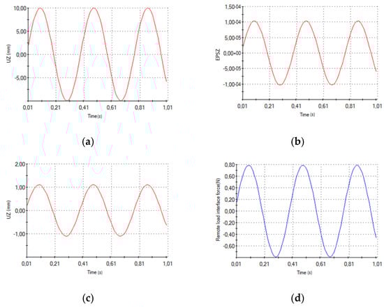 FEA screens from Solidworks: (a) imposed displacements at the free end over time, (b) Z-normal nodal averaged strain on upper PPT surface over time, (c) displacements along Z-axis at 100 mm from fixed joint cross-section over time, and (d) nodal averaged reaction force along Z-axis at 100 mm from fixed joint cross-section.