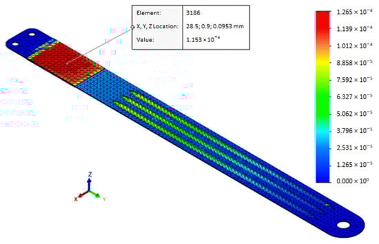 Figure 9 presents some of the characteristics that were computed through a finite element analysis (FEA). First of all, Figure 9a shows the displacement that was imposed to the free end. In Figure 9b and c, the mean strain into the plane normal to Z-axis on PPTs surfaces and the displacement detected in a nodal point at 100 mm from the fixed joint are shown, respectively. Figure 9d displays the reaction force trend that was evaluated on the cross-section of the deformable band at 100 mm from the fixed joint. FEA results exhibits a maximum strain along the deformable band on PPTs surfaces that equals 1.534 × 10−4 mm/mm (Figure 10), corresponding to the maximum displacement of the free end (10 mm). Strain magnitude values were estimated in this configuration to be sufficient to generate a suitable electrical response of PPTs, according to the scientific literature [20].