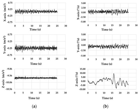 As expected, the Z-axis output from the accelerometer of iNEMO inertial module remained constant for the whole test and equal to nearly −9.73 m/s2 (Figure 10 and Table 4). It means that the scaled buoy remained integral to the vertical wave motion. The three-axis gyroscope also did not detect appreciable variations in angular oscillations, returning mean values of about 0.40°/s around X-axis and −0.63°/s around Y-axis (Table 5).