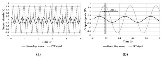 The sinusoidal laws of outputs from PPT and displacement sensor are shown in Figure 13b. These were calculated while considering the mean values of magnitude and frequency of each signal and the phase between the same signals in the total duration of the test.