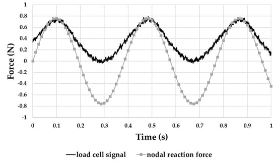 Under the same sinusoidal load condition (frequency of 2.6 Hz and peak-to-peak magnitude of 1.9 mm), as described in Section 4.2, the load cell in series with the shaker stinger provided the trend of Figure 14. Additionally, the values from the FEA (Figure 9d) are indicated.