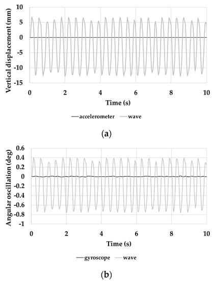 (a) comparison between the vertical displacement measured by accelerometer along the Z-axis and the wave magnitude; and, (b) comparison between the angular oscillation measured by gyroscope around X-axis and the oscillation occurred by the wave.
