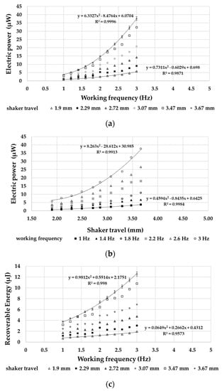 Electric power values, as shown in Figure 16a and b, denote a monotonous dependence with respect both the magnitudes and frequencies of the imposed motion, with a distinctly parabolic trend line. The energy values, as shown in Figure 16c, exhibit an energy harvesting trend in agreement with the scientific literature [28].