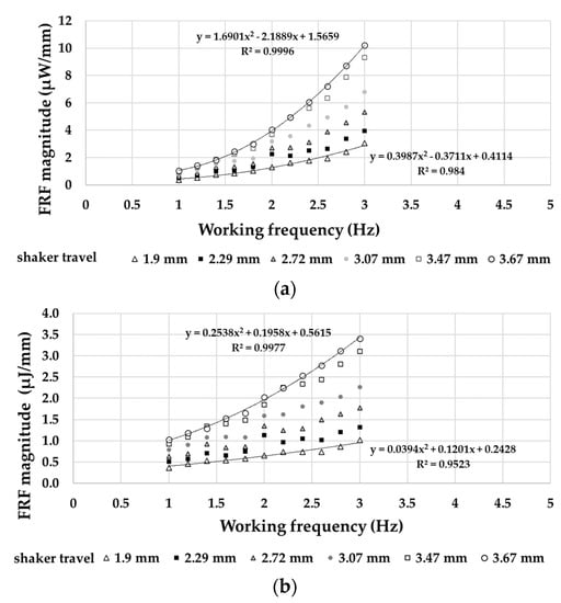 An experimental investigation on the frequency response functions (FRF) of the harvester was carried out. In this context, power and energy were chosen, respectively, as the output variable, while the linear displacement that is supplied by the shaker as the input variable. Figure 17a and b display the modules of power/magnitude ratio and energy/magnitude ratio, respectively, as the working frequency changes.