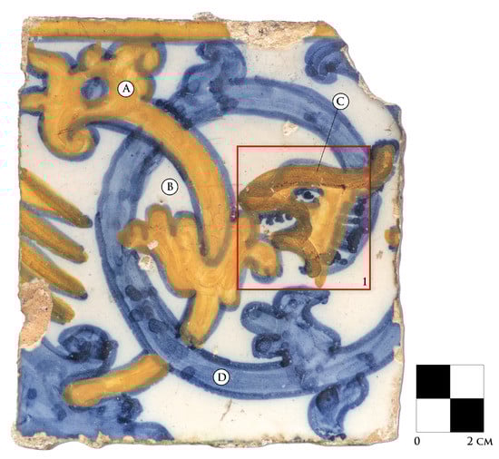 A Portuguese tile (azulejo) from approximately the 17th century was investigated with the proposed Macro-X-Ray Fluorescence (MA-XRF) scanning system and complementary techniques. The azulejo is shown in Figure 1, where four colours can be identified—yellow (A), white (B), orange (C), and blue (D). Area 1 represents the region investigated through MA-XRF scanning.