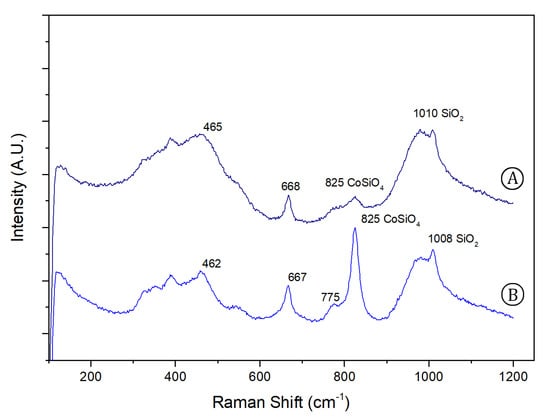 Figure 5 shows the -Raman spectra obtained for the blue glazed regions, which seems similar at first sight, besides representing different intensities of blue. One is a dark, intense blue, and the other, a lighter blue with glassy appearance. This difference could be explained due to the presence of a Raman band peaking at 824 cm that allows a clear identification of a cobalt blue pigment: cobalt silicate (CoSiO), olivine type, which has been previously reported by de Waal [28] and, recently, Ferreira [29].