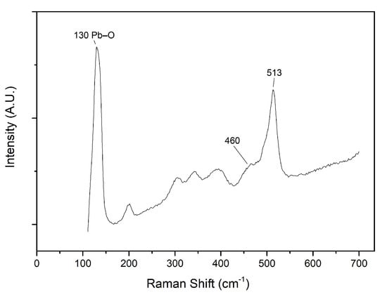 The very strong band at 130 cm is reported for the Pb-O lattice vibration at low wavenumbers (120–139 cm), and should not be used as a good discrimination band for ternary oxides. Furthermore, it varies significantly even for unmodified Naples Yellow and different firing temperatures for the pigment [34]. It is worth noting that for Zn modified Naples Yellow, this band usually appears at 145 cm, while for the Sn modified, it shows a doublet at 125 and 142 cm [33].