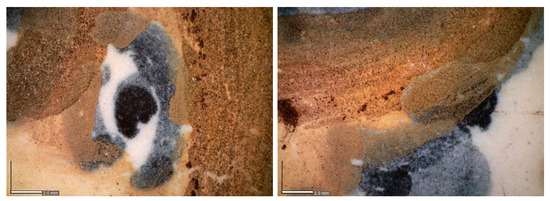 Analysing the orange colour under a microscope, the pigment reveals itself more similar to the yellow one indeed, but rougher, with the presence of dark spots, and without the characteristic shiny and transparent layer present on top (Figure 7). This last stratum (coperta) is a very thin layer of powdered glass sprinkled on top of ceramics in order to conceive a shiny and smooth aspect to the final product [35].
