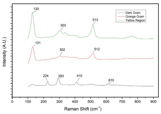 To further understand the pigments’ nature, -Raman spectra (Figure 8) were analysed. They appear to be very akin to the spectra obtained from the yellow region, showing similar bands and peaks (at ca. 131, 302 and 512 cm) and indicating the use of a mixture obtained from the modified Naples Yellow and other components, as previously seen in the yellow colour.