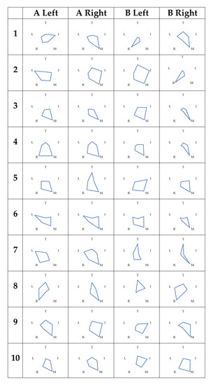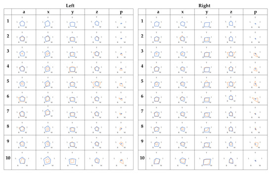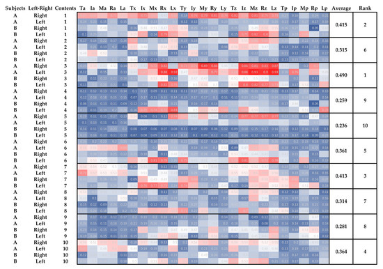 A paired t-test was used for the left and right significant difference test. For the between-subjects significant difference test, we used the Student t-test, the Welch t-test, and the Wilcoxon signed-rank test, as a result of the Shapiro–Wilk test and the F-test. The table below showed the significant differences (Table 3).