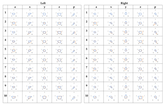 Figure 3 showed the variability of each finger’s data for each item in subject A, represented by radar charts for each grip-and-release condition. Condition 1 is shown in blue, and conditions from 2 onward are shown in orange to overlap with condition 1. Similarly, the radar charts for subject B are shown in Figure 4.