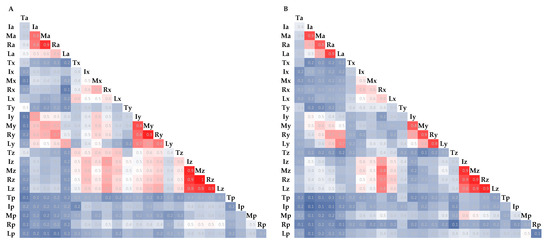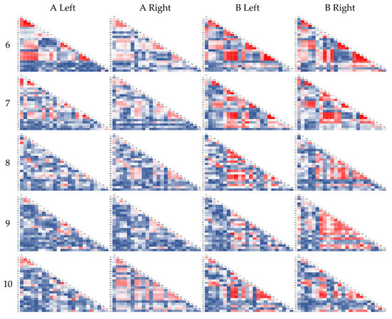 Compared with Figure 7, the relationship between the index, middle, and ring fingers tended to be stronger in condition 6; after 7, it tended to be weaker. Subject A had a particularly low correlation. There was also a high correlation between subject A’s right hand in condition 10. Subject B correlated highly with the right hand in condition 9.