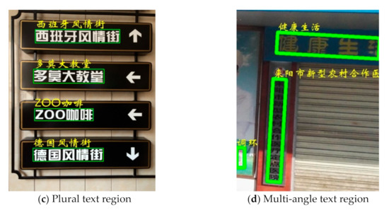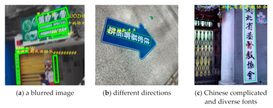 Scene images are usually blurred, distorted, covered with large shadow, or low resolution. At the same time, the enormous variety of fonts, directions, and sizes of scene text increases the difficulty of its detection and recognition. Multilingual recognition is also a large challenge for scene text recognition. Apart from digits and symbols, this paper deals with Chinese and English recognition. Compared with English, Chinese characters have more complex structures with often the same or similar strokes, which further increase the difficulty of recognition. The above factors lead to the unsatisfactory effect of most text recognition models. Figure 1 shows several examples, in which green boxes are detection marks and yellow fonts are the recognition results. Figure 1a–c represent a blurred image, different directions, and Chinese complicated and diverse fonts, respectively.