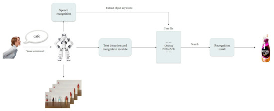 Figure 2 shows the framework for the robot to recognize objects according to human instructions. The robot transforms keywords of human instruction into texts by speech recognition and then identifies texts on every object. When the result of the current object includes keywords from the human instruction, the robot stops the recognition and takes the object, and it otherwise continues to recognize the next object.