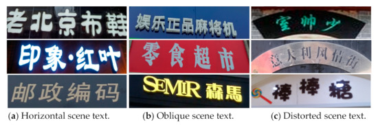 - Shi, B.; Yao, C.; Liao, M.; Yang, M.; Xu, P.; Cui, L.; Belongie, S.; Lu, S.; Bai, X. ICDAR2017 Competition on Reading Chinese Text in the Wild (RCTW-17). In Proceedings of the 2017 14th IAPR International Conference on Document Analysis and Recognition (ICDAR), Kyoto, Japan, 9–15 November 2017; Volume 1, pp. 1429–1434. [Google Scholar]