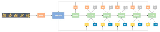 The text image is fed into CNN to extract features map V; then, the attention weight is calculated according to Equation (4). is the context vector by calculating feature vector V and attention weight by Equation (5). The character probability is calculated according to Equation (6) and the predicted word embedding . Repeat this process until all characters are recognized. The detailed explanation of this model is presented in Reference [9]. The LSTM is improved by adding the current attention to analyze the feature sequence.