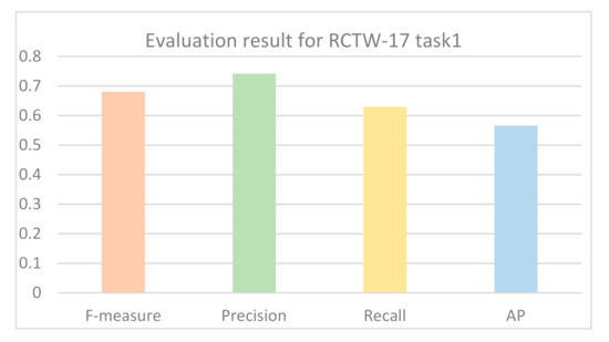 The common evaluation indicators for text detection are Recall, Precision, F1-measure, and Average Precision (AP). F1-measure and AP are comprehensive evaluation indicators. The detected text region coordinates and confidence are submitted to the RCTW-17 competition platform (https://rctw.vlrlab.net/08/03/2020, accessed on 8 March 2020). The F-measure, precision, and recall obtained on task1; that is, detection task of RCTW-17 are 0.6817, 0.7424, and 0.6302, respectively, as shown in Figure 8. The AP is 0.5664. Table 2 lists the results comparison between our algorithm and state-of-the-art methods on the dataset RCTW-17. The recall rate of the proposed method reaches 63%, which is higher than those of other methods. The accuracy rate of the proposed algorithm is 74.2%, which also exceeds the other algorithms in terms of F1 measure.