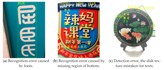 where D(:) stands for the Levenshtein Distance between and , which denote the predicted text line in a string and the corresponding ground truths in the regions, respectively. As the norm approaches 1, the performance increases. Table 3 presents the comparison between our method and the other methods. The results show the competitiveness of the proposed recognition module. Figure 9 shows the recognition results of our method in (a) a single text region, (b) a multi-scale text region, (c) a plural text region, and (d) a multi-angle text region. Figure 10 shows several failed recognition cases. Figure 10a shows that the detection is correct, while the text recognition itself is incorrect. In Figure 10b, the incorrect text region location due to the incompleteness of its fan-shape results in the incorrect recognition. In fact, occlusion and missing are a major difficulty in scene text recognition. Figure 10c shows a recognition error caused by recognizing a deeper texture as a text region.