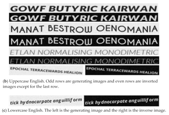 Figure 10c shows that the background of the image affects the text detection. Thus, we invert the generated dataset by rendering the background of the image to black and texts to white. Figure 11 shows the comparison between the original generated dataset and its inverse. Based on previous studies [9], dataset ICDAR2019 Art, LSVT, and ReCTs serve as the training set. In addition, the generated dataset and its inverted version are added in the training phase respetively, and then the verification is performed on RCTW-17. Table 4 lists the results. “Ours (generated)” indicates the training on datasets including ICDAR2019 and the generated dataset, while “ours (inversed)” means the training on dataset including ICDAR2019 and the inverted dataset. The results show that inverted images with less interference, such as background texture, effectively improve the recognition accuracy.