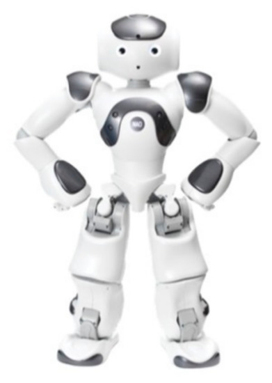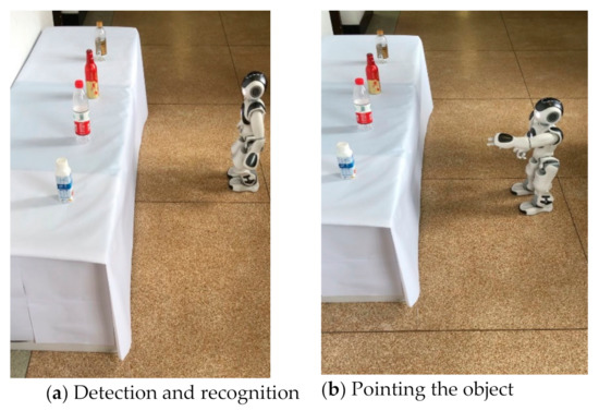 After improving the model recognition accuracy by generating datasets and their inverse, we apply the trained model to the Nao robot to enable its recognition of different types of household objects with similar shapes, similar objects with different shapes, and different types of objects with different shapes. Nao is a humanoid robot developed by Aldebaran Robotics, as shown in Figure 12. Nao has two 2D cameras to capture images and can recognize some basic shapes, objects, and even people. Nao has also four directional microphones and speakers to interact with humans, and it performs speech recognition and dialogue available in 20 languages, including English, French, and Chinese. Therefore, Nao is especially applicable as the research platform of the home service robot.