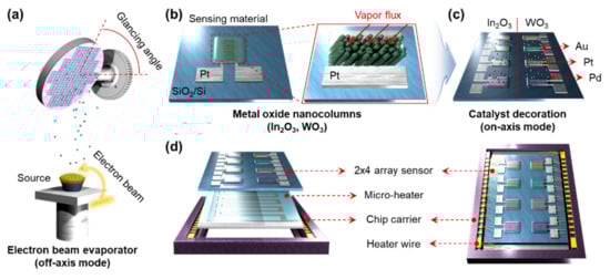 Highly porous nanostructured metal oxides have been mainly used as gas sensing materials because of their large surface-to-volume ratio, narrow necks between each grain, and effective gas accessibility. In our previous work [25], the glancing angle deposition (GAD) method was reported to fabricate useful gas sensing materials. As shown in Figure 1a, the 300-nm thick nanorods metal oxide including (In2O3 and WO3) was evaporated on the Pt interdigitated electrodes (IDEs) using the GAD method at a glancing angle of 80°. When depositing the metal oxides, the incident angle of the vapor flux generates the self-shadowing effect, resulting in the highly porous nanostructured materials (Figure 1b). Subsequently, the catalysts, including Au, Pt, and Pd was evaporated on the surface of the metal oxides with different thickness of 1–2 nm (Figure 1c). The Au, Pt, and Pd were deposited under the condition of becoming a uniform 1 or 2 nm-thick film. To reduce the deposition and photolithography sequences, we chose the 2 × 4 array, which maximizes the sort of gas sensor up to eight sensors. The 2 × 4 array sensor can drastically reduce the number of deposition and photolithography processes required for sensor fabrication. The identical sensing materials and catalysts are deposited for the vertical and horizontal directions, respectively. All fabricated sensor array was annealing at 550 °C for 2 h to crystallize the metal oxides. The catalysts were aggregated to nanoparticles, resulting in the metal oxide NRs decorated with the catalyst nanoparticles on the surface. Subsequently, the 2 × 4 sensor array was mounted on the Au-based micro-heater for back heating and the chip carrier for electrical connecting (Figure 1d).