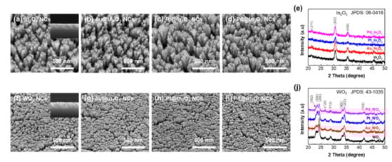 Top-view and cross-sectional (inset) FE-SEM images of (a–d) bare, Au-, Pt-, and Pd-decorated In2O3 nanorods, (f–i) bare, Au- (2 nm), Pt- (1 nm), and Pd- (2 nm) decorated WO3 nanorods. X-ray diffraction pattern of (e) In2O3 and (j) WO3 nanorods as a function of decorated catalysts.