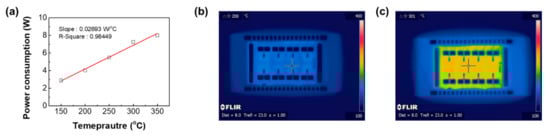 (a) Power consumption of the micro-heater. Infrared images of 2 × 4 sensor array with different operating temperature; (b) 200 °C and (c) 300 °C.