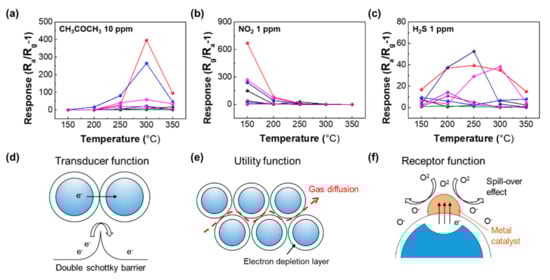 Response of the 2 × 4 sensor array to (a) 10 ppm CH3COCH3, (b) 1 ppm NO2, and (c) H2S 1 ppm vs. the wide range of operating temperatures from 150 to 350 °C. (d) Transducer function, (e) utility function, and (f) receptor function and spill-over effect that represent gas mechanisms.