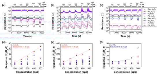 The sensing properties of the semiconducting gas sensor are highly affected by the operating temperature; with an increase in the temperature, the gas adsorption rate increases due to reduced activation energy with the sensing materials, resulting in the enhancement of the gas response. However, the gas response tends to decrease above a certain temperature since the desorption rate also increases. Therefore, the operating temperature optimization according to the target gases is essential for the semiconducting gas sensors. We selected CH3COCH3, NO2, and H2S as representative biomarkers of diabetes, asthma, and halitosis, respectively [26]. Figure 5a–c show the 2 × 4 sensors’ response to CH3COCH3, NO2, and H2S gas over a temperatures range of 150–350 °C with a setting span of 50 °C for the precise temperature classification and efficient experimentation. The slight modulation of gas flow rate can influence on the operating temperature although a constant flow rate was set to 1000 sccm in this experiment. However, the base resistances of all sensors are not significantly changed for the measurement, indicating that the operating temperature is identical or is less affected by the slight modulation of flow rate. The response of the sensor is defined as Ra/Rg − 1 in reducing gas and Rg/Ra − 1 in oxidizing gas, depending on the gas type [27]. Ra indicates the sensor resistance in the absence of gas, and Rg denotes the resistance in the presence of target gas. In the case of CH3COCH3, the overall detection performance was excellent at 300 °C, and Au-decorated In2O3 NRs and Pt-decorated In2O3 showed the highest response compared to other sensors (Figure 5a). On the other hand, NO2 shows the highest detection performance at 150 °C, and Au-decorated In2O3 NRs show the highest response (Figure 5b). For H2S, Au-decorated WO3 NRs showed high detection characteristics at 250 °C (Figure 5c). The optimized temperature for the gas sensors is determined by the adsorption as mentioned above and desorption rates depending on the target gas. Moreover, the oxygen species on the surface of the metal oxide can affect the optimum temperature. With increasing the temperature, the negatively charged oxygen species are generated. It is known that the ionosorption (O2−) of physisorbed oxygen is formed at more than 100 °C. Subsequently, the oxygen is chemisorbed on the surface as a form of O− up to 350 °C. Above the temperature of 350 °C, O2− is generated by extracting the electrons from the metal oxides. Based on these reactions, NO2 competes with O2 to adsorb on the metal oxide surface, indicating a lower response at a high operating temperature [28]. In contrast, the reducing gases involving CH3COCH3 and H2S show a higher response at high temperature. Therefore, we adopted optimum temperatures of 300, 150, and 250 °C towards CH3COCH3, NO2, and H2S, respectively. The high response of our sensor array was elucidated by utility factor, transducer function, and receptor function. The narrow necks between each NRs can enhance the response to target gas (Figure 5d), and the high porosity enables effective target gas accessibility (Figure 5e) [29]. The use of catalysts in the gas sensors has been considered as a promotor of gas adsorption by a spill-over effect (Figure 5f) [30].
