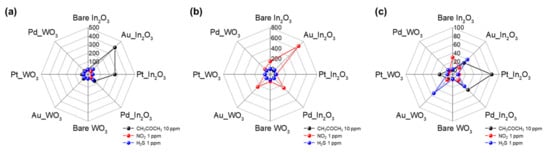 To clearly demonstrate the selectivity of our sensor array, we plotted the polar plots. Figure 7 shows the response of 2 × 4 array sensor to CH3COCH3 10 ppm, NO2 1 ppm, and H2S 1 ppm at the optimized temperature (300, 150, and 250 °C). For the Figure 7a,b, the single target detection of CH3COCH3 and NO2 was clearly observed because both gases are highly dependent on the temperature (Figure 5a,b). Furthermore, the selective detection at 250 °C in Figure 7c is achieved by different patterns with each target gas.