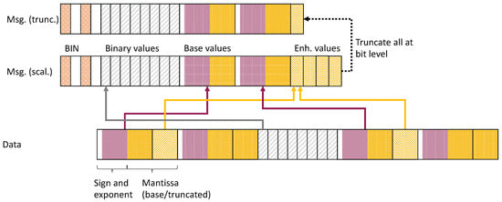 Additionally, the floating-point values themselves can be modified as well, leading to additional savings through lossy, but speedy compression. BINBLISS enables arbitrary truncation of the number of bits used for the significand or digit part of floating-point values, as in the common IEEE 754 standard [49]. This bit reduction reduces accuracy, but yields additional compression data savings. The removed bits can be appended to the message and be dynamically used or dropped by intermediate or receiving nodes, resulting in a bitplane-level scalability. Figure 1 illustrates this principle by moving the base values (exponent part and truncated significand part) into the main message and the removed bits are appended after all contained values in round-robin fashion, enabling the bitplane-level scalability, which subsequently can be truncated as needed.