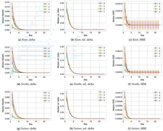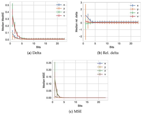 We observe a significant drop in the delta as the number of mantissa/significand bits increases, with more than 9 bits not yielding any additional improvements. In turn, we can derive that the overall granularity of measurements could likely be well-captured with 16-bit floats. The exponential decrease of errors, further separated into the three dimensions x , y , z as well as the combined origin vector length v. We note that the dominant deviation is for the z-axis, which is almost the same as the resulting v. Once the overall threshold of about 4–5 bits is passed, the changes become minor. However, one must put these changes into perspective of the underlying base values. The relative delta showcases that initially, very high deviations occur, which rapidly fade. The relative displacement of v as result of the compression indicates that the combined effect of the compression might be less noticeable than the absolute values indicate, especially considering for more than 3 bits. A view of the MSE results additionally showcases the impacts we noticed when considering the absolute delta values, though more pronounced. Again, the median MSE drops sharply after 3 bits.