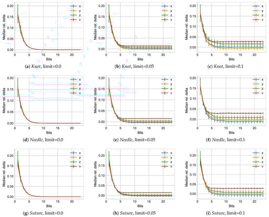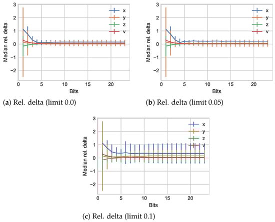 We initially observe the same behavior as before with a limit of l = 0 resulting in almost the same outcomes that one would obtain if delta-coding were disabled. As a limit of 5% changes enables perceptual coding, we observe a separation of the four different values, with v exhibiting the highest relative delta overall. Although for very low numbers of bits employed all exhibit median relative deltas around 17.5%, this quickly diminishes to about 2.5% when 5 bits are employed. Overall, this also seems to provide an overall threshold for the displacement vector to remain stable while the remaining x , y , z components continue to drop slightly lower until reaching 9 bits. As before, increasing the perceptual limits further results in additional error increases, albeit at a lower level.