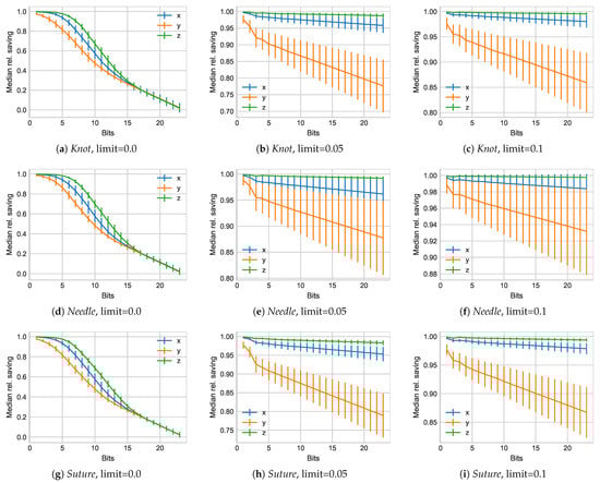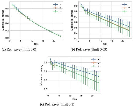 We initially observe significant changes for all three values around 85% as maximum when using only one bit for the mantissa. Although there is a minor variation in between the three axes’ values, overall, they remain close. Increasing the number of bits almost linearly decreases the attained savings with values beyond 9 bits identical for all three dimensions. As the change limit is increased to 5%, we notice a significant separation of the x and y , z value results. Specifically, we observe that the relative savings for y , z values decrease faster as more bits are added. A slight plateau forms between 3 and 4 mantissa bits. We also note that the highest overall relative savings level for x values is now close to 95%, while y , z values trail by a few percent. One of the reasons here could be the actual source of the data, with less dynamic data in y , z directions and more on the x axis. Increasing the change limit threshold for perceptual coding considerations further, we notice an increase of the prior observations. Noteworthy here is the slight dip at 2 mantissa bits, followed by a rise and subsequent linear trend as before. The savings shifts and plateaus can be explained by the different captures of difference levels in the available bit levels.