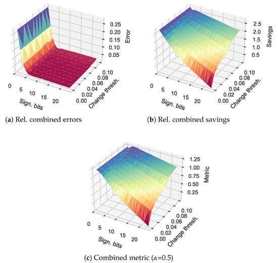 In this section, we provide an initial performance metric that combines the relative savings as well as the relative errors introduced to determine an ideal operational point. We provide an overview of the median relative combined errors, savings, and a combined metric as result of the interplay of bits and perceptual change threshold in Figure 8 for the TUM traces. We provide this overview for the combined error v e r r and the individual combined savings x s a v e , y s a v e , z s a v e . We finally combine the two in a simple metric as