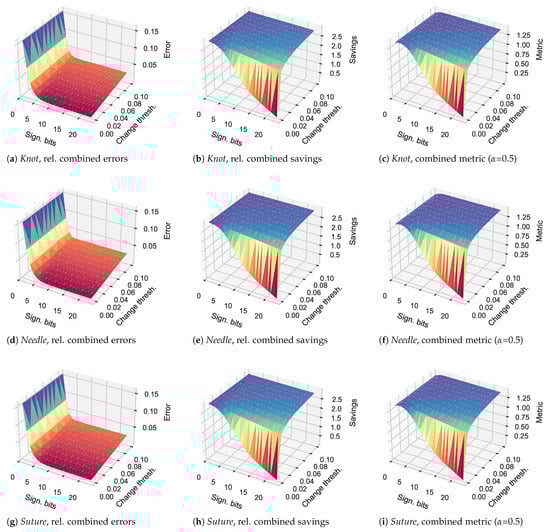 Figure 9. Relative errors, savings, and combined metric results for the three different JIGSAWS datasets with different bit limits and change thresholds for perceptual coding.