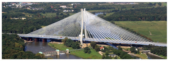 - Biliszczuk, J.; Barcik, W.; Onysyk, J.; Toczkiewicz, R.; Tukendorf, A.; Tukendorf, K. Rędziński Bridge in Wrocław—The largest concrete cable-stayed bridge in Poland. Struct. Eng. Int. 2014, 24, 285–292. [Google Scholar] [CrossRef]
