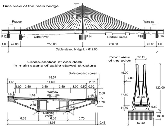 The Rędziński Bridge was built in 2011 and it is the main bridge within the Wrocław motorway ring-road. The structure is a concrete cable-stayed bridge with the spans of 49.00 m + 256.00 m + 256.00 m + 49.00 m. The H-shaped pylon is 122.00 m high (Figure 1) measured from the foundation top surface.