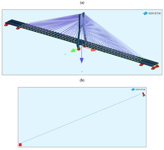 The FEM models: (a) the general bridge model; (b) a detailed single strand model.
