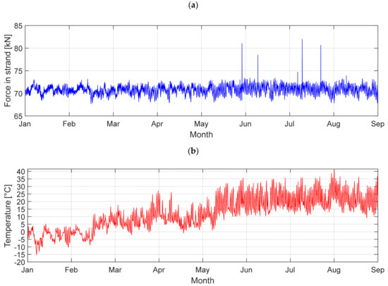 The analysis of the temperature change’s influence on cable forces was started with the comparison between annual summer and winter values. Diagrams from the SHM application showing the force and temperature plots in one of the longest cables between January 2017 and August 2017 are presented in Figure 6.