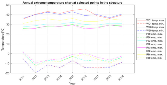 In order to obtain a wider description of the nature of the work of the bridge structure, the changes in extreme annual temperatures in individual elements of the structure were additionally checked (Figure 7).