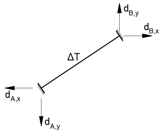 However, the measured temperature values can be used for the local calculation of structural elements. For this purpose, the measured temperature changes were used to calculate a single strand in the FEM model. This model, as mentioned, is described by the nonlinear material model and geometry characteristics as well. The crucial value in these calculations was the starting daily strand tension force. Then, a uniform temperature change ΔT was applied to the strand. Additionally, displacements of the theoretical anchorages, resulting from heating or cooling in the global bridge model, were implemented (Figure 8). The calculations were performed by automatic iterations, where the temporary structure stiffness was saved after each step. The calculations ended when the stiffness and cable sag values had been stabilized.